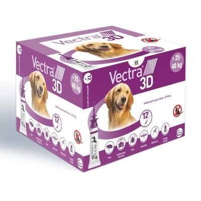 VECTRA 3D Spot-on pour chiens est un antiparasitaire utilisé pour le traitement et la prévention des infestations par les puces et les tiques. Il a également une activité répulsive et insecticide persistante contre les moustiques, mouches d'étable et phlébotomes.
