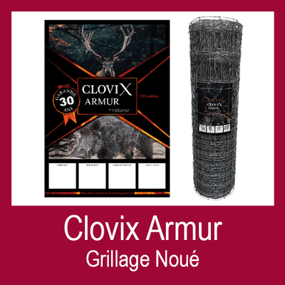 Le grillage CLOVIX ARMUR est conçu pour protéger et empêcher toutes les intrusions ou les fuites de faune sauvage. Il est idéal pour la protection des cultures, parcs, forêts, routes, autoroutes et voies ferrées. Issu d’un acier de première fonte, le métal du grillage Clovix Armur est revêtu de la meilleure protection anticorrosion du marché (zinc alu) il offre une durée de vie X5 par rapport à un galva classique. Les nœuds spécifiques en "croix" assurent une résistance maximale.